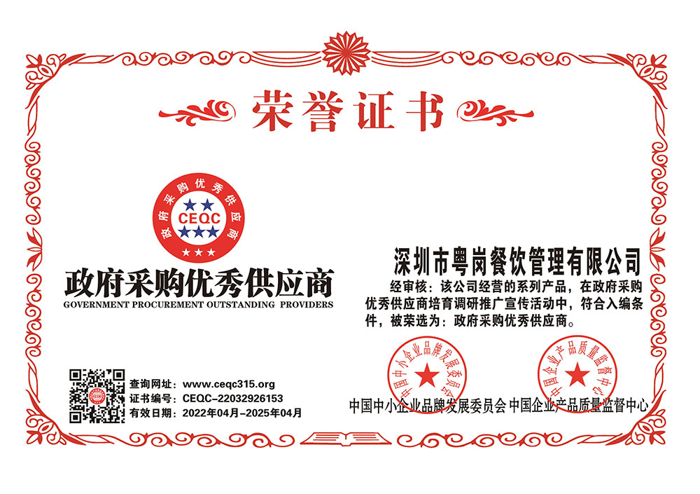 深圳市粵崗餐飲管理有限公司,是一家集蔬菜種植和農(nóng)副產(chǎn)品配送為一體的專業(yè)型餐飲公司,主要為學校、工廠企事業(yè)機關(guān)單位提供蔬菜和農(nóng)副產(chǎn)品配送服務(wù)。公司自成立以來始終以質(zhì)優(yōu)價廉、服務(wù)至上為原則,嚴格按照ISO:9001國際標準體系進行管理。同時建立了行業(yè)領(lǐng)先的配送中心、大型冷庫和保鮮庫、檢測中心以及專業(yè)化的配送團隊,能長期安全、穩(wěn)定、準時的配送貨物。我們所有蔬菜均經(jīng)過初步加工、無黃葉,無泥沙等雜質(zhì),利用率達97%以上...保障向用戶提供的各類食材的衛(wèi)生和質(zhì)量。公司為了適應(yīng)不同客戶的需求,配有專業(yè)人員和配送車輛,實行“一對一”的服務(wù)體制,一心一意的為客戶服務(wù),秉承粵崗誠實守信、服務(wù)第一、客戶至上的服務(wù)標準,真正讓客戶花最少的錢吃最好的菜。粵崗多年來何以欣欣向榮,因為我們知道只有勇于擔當責任,才能承擔更大的責任,就是因為 粵崗員工貫徹公司態(tài)度決定一切、細節(jié)決定成敗的真理,從質(zhì)量抓起,從服務(wù)做起,才創(chuàng)造了如今的規(guī)模化供應(yīng)、統(tǒng)一性配送、專業(yè)化服務(wù)的粵崗。